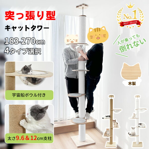 ペットグッズ 【おすすめ】【月末SALE!1000円OFF⇒7898〜】\楽天1位・20冠達成/RAKU 日本メーカー 1年保証 キャットタワー 突っ張り 極太 木製 大型猫 多頭飼い スリム 宇宙船 爪とぎ 省スペース 183-270cm 麻 コットン|口コミ4.1点(697件)